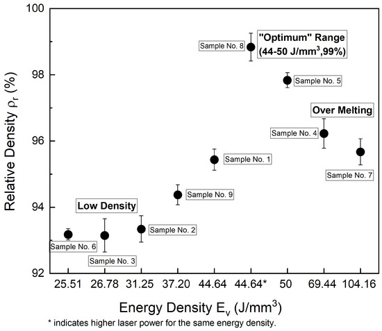 | Sample | Laser Power (W) | Scanning Speed (mm/s) | Hatch Spacing (µm) | Energy Density (J/mm3) |
