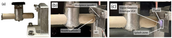 (a) Lateral view of the PEP-Jet process without a workpiece. (b) Lateral view of PEP in a jet process without electrical discharge. (c) PEP-Jet process “ON” where the negatively charged electrolyte impinges onto the anodic metal surface of the stainless steel. The gaseous vapor layer establishes itself on the metal surface before the plasma is formed. Polishing occurs at the impinging zone’s plasma–metal interface, enabling homogenous localized polishing.