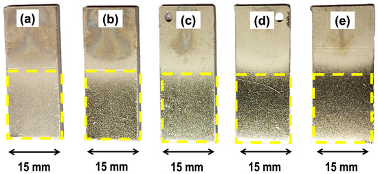 Optical macrograph images of stainless steel 316L anodic workpiece after PEP process treatments of 518 surface area of sample for different time periods: (a) 1 min, (b) 2 min, (c) 3 min, (d) 5 min, (e) 7 min.
