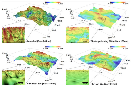 Confocal microscope analysis was used to examine the surface quality of 316L stainless steel samples before (annealed) and after undergoing EP, PEP, and PEP−Jet treatments. For each sample, macroroughness (Sa) was measured for a surface area of 0.3 , while comprehensive enlargement images show the microroughness profiles. Different polishing times were applied to each sample to ensure uniform surface energy density.