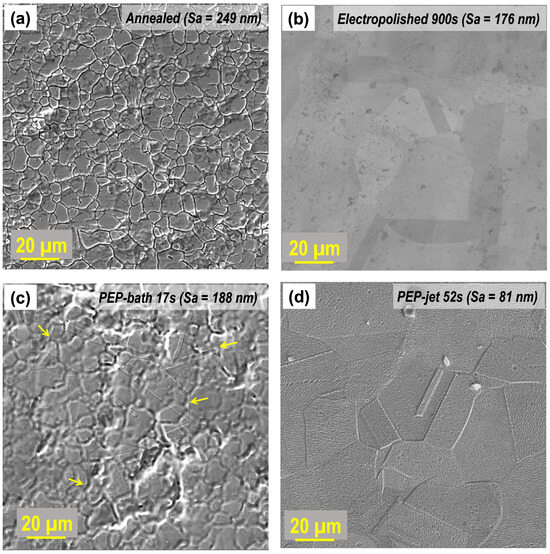 Figure 6 displays the SE images of surface morphology for the annealed sample (Figure 6a) and the EP, PEP, and PEP-Jet polished samples (Figure 6b–d), revealing distinct topographical and microstructural variations. The SEM micrographs of the annealed sample exhibit a granular-like surface morphology, as depicted in Figure 5 and Figure 6a. A smooth surface with well-defined grain boundaries at the micrometer scale is visible when the surface is treated using conventional EP for 900 s (as shown in Figure 6b), revealing a crystalline structure. The evidence shows that the size of the granular-like structure observed in the annealed sample (Figure 6a) is much smaller than the grain size of the material detected in the EP sample (Figure 6b). This confirms that the granular-like structure is related to the topography of the stainless steel with its native oxide layer. The SEM micrograph in Figure 6c shows that a sample subjected to plasma electrolytic polishing in a bath electrolyte (PEP bath) for 17 s exhibits a diminished fraction and intensity of the granular structure in comparison to the annealed sample state. This observation can be attributed to the electrochemical effects associated with selective material removal, which is also confirmed by the significant decrease in Sa value to 188 nm. Additionally, visible grain boundaries begin to appear during this short PEP-bath process, as indicated by the yellow arrows in Figure 6c. The SEM micrograph in Figure 6d shows the microstructure of a heavily etched stainless steel sample treated with PEP-Jet. The surface roughness of this sample is the lowest (Sa = 81 nm) and is characterized by small, well-defined crystalline grains with a distinct appearance of predominantly intergranular cells within individual grains. Due to the random dissolution of crystallography planes, as can be seen in Figure 6d, surface brightening is also promoted [28]. Polishing may leave craters on treated surfaces (Figure 6d) due to discharge, indicating unstable plasma discharge conditions [29]. In addition, the intergranular cells are believed to be associated with the Mo-precipitate phase that is commonly observed in this type of material [30,31]. This is expected to enhance pitting corrosion resistance in particular [32,33].