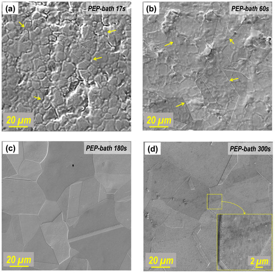 Secondary electron (SE) images of surface morphology of stainless steel 316L workpieces after being processed with the PEP-bath technique for different durations: (a) 17 s, (b) 60 s, (c) 180 s, and (d) 300 s. The yellow arrows indicate the presence of grain boundaries. The detailed microstructure within the grain for the PEP-bath 300 s sample is shown in a yellow dashed rectangular shape, revealing the interior part of the microstructure as observed for the PEP-jet sample (see Figure 6d).