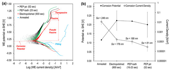 Corrosion rate measurements were conducted using a dedicated corrosion rate analysis feature in Metrohm Autolab with NOVA software version 2.1.4. The formulation is based on anodic and cathodic Tafel analysis. The linear polarization technique was employed for annealed and differently polished samples to investigate the impact of surface finish on the corrosion resistance of stainless steel 316L. The typical anodic polarization curves are depicted in Figure 8a, while the calculated corrosion potentials and current densities are available in Figure 8b. For annealed samples, pitting corrosion is already observable even at the low potential and initial stage of the corrosion process, indicating imperfect and unstable passive film formations. In contrast, Figure 8a shows that all polished samples exhibit a wide range of pseudo-passive behavior from their corrosion potential and are completely passive at the later potential. In comparison with the annealed state, Figure 8b demonstrates that all polished samples exhibit significant enhancement of the corrosion potential and reduction of the corrosion current density (corrosion rate), indicating a more stable passive film formation and a higher corrosion resistance for polished samples. A sample treated using the PEP-Jet technique shows the lowest corrosion current density among the polished samples studied here, but they show similar corrosion potentials. It is also observed that the corrosion rate/current density also decreases with decrease in roughness value Sa of materials [34,35], which could be related to the total surface area involved for the corrosion process and the number of critical points affected in localized corrosion (e.g., pits formation and hydrogen evolution) [36,37].