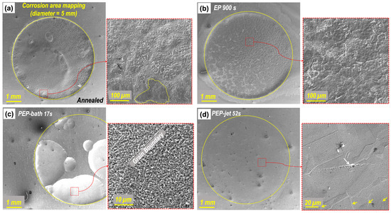 The latter of the SEM micrographs (Figure 9) pertains to the surface corrosion tests conducted to compare the efficacy of the three distinct finishing techniques in enhancing surface quality and corrosion resistance. The images (Figure 9) reveal diverse responses to the corrosion tests among the treatments (i.e., anodic polarization to 1.0–1.1 V beyond the corresponding corrosion potentials). First, SEM images of annealed samples (Figure 9a) show a visible uniform corrosive effect with a circular boundary, indicative of pronounced corrosion, especially when compared with other surfaces. A high magnification image of this sample discloses a rather homogeneous corroded surface, resulting in an overall thinning of the surface of the sample. In addition, SEM images also observe the typical electrolytic polishing effect, resulting in the visible presence of grains and grain boundaries as indicated within the yellow dashed line in Figure 9a. These outcomes closely resemble the post-corrosion tests conducted on electrolytically polished samples (Figure 9b) that exhibit similar microstructures, particularly in the magnified image of Figure 9b. The image following the PEP treatment (Figure 9c) displays a distinct surface response. The observed specimen exhibited discernible corrosive effects, coupled with an increased resistance to corrosion. Nevertheless, under magnification (Figure 9c) of the corroded surface, an altered surface structure becomes apparent, marked by heightened roughness and the presence of irregularities like small pics. It is believed that this structure originates from the etching/corrosion of interior parts of grains due to an increase in polarization potential. The grain boundary paths are also recognizable as marked with the white dashed line in Figure 9c. This surface modification is totally different from the conventional corrosion effects observed in the initially annealed and EP-treated sample, but it exhibits microstructures that are identical to those in the sample subjected to the PEP-Jet approach (Figure 6d). On the other hand, post-corrosion SEM micrographs obtained for a PEP-Jet treated sample (Figure 9d) show a markedly smoother surface with no conspicuous signs of corrosion due to the test. The SEM magnified image within the corroded area shows only an exceptionally pristine surface with most of the grains and even grain boundaries slightly affected by the corrosion test, except for a few irregular corrosion spots, as marked with a white arrow, and the further etched and probably cracked grain boundaries, as indicated with the yellow arrows.