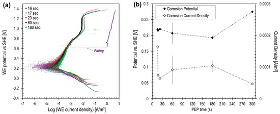 (a) The representative anodic polarization curves and (b) the profiles of corrosion potential versus SHE and current density for PEP-bath treated samples processed for different time period from 16 s to 300 s. The pitting corrosion is only observable from a PEP-bath 16 s sample as marked with a violet arrow. The significant reduction in corrosion current density was observed between 16 s and 23 s, during which the corrosion potential remained constant. Subsequently, from 23 s to 180 s, a notable decrease in corrosion potential accompanied by an increase in current density was documented. Furthermore, an inversely proportional phenomenon was discerned with extended PEP polishing times, resulting in a decrease in corrosion current density and an increase in corrosion potential.