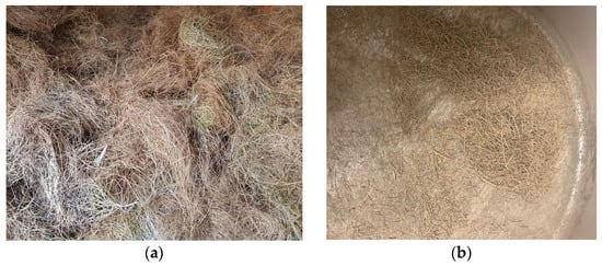 The raw coconut fibers show length varying from 15 to 35 cm and diameter from 50 to 300 mm [19]. The fibres sourced from Agroproteinka varied in length and thickness (between 5 and 15 cm), and were also contaminated, filled with soil and fine particles from coconut shells. To obtain fibres of approximately equal length and thickness (diameter), the Mixer Mill MM 200 from Retsch was used, which ground the fibres down to approximately 0.5 to 2 cm. Figure 3a shows coir fibers before grinding, and Figure 3b shows them after grinding in the mill.