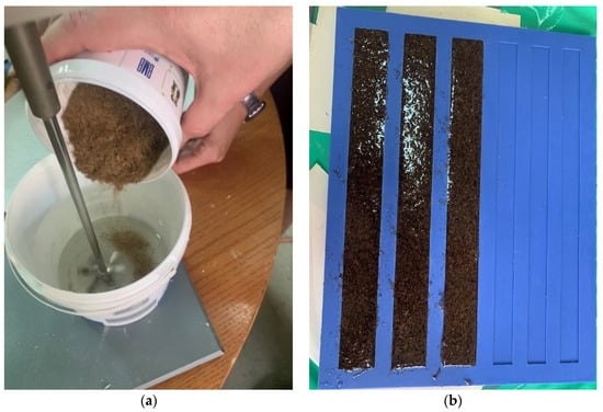 The resin and hardener were first mixed by hand, then using a mixer from Tehtnica Železniki, capable of reaching 4000 revolutions per minute. Coir fibres were gradually incorporated into the blend (Figure 4a). Once the reinforcement and matrix were thoroughly mixed, the material was poured into moulds, filling the mould cavities (Figure 4b).
