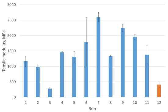 Tensile modulus values: blue represents the experimental runs, while orange corresponds to the pure epoxy resin.