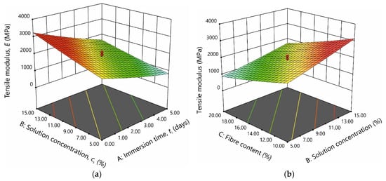 Figure 6 displays the tensile modulus for each run of the experiment and for the pure epoxy resin to compare the obtained results. In addition to the values, error bars, i.e., deviations from the results, have been added to the diagram. Figure 7a illustrates the relationship between tensile modulus and both immersion time and solution concentration, while Figure 7b depicts the correlation between tensile modulus, fibre content, and immersion time. The figure illustrates a decrease in tensile modulus with extended immersion time and higher fibre content, while an increase is observed with higher solution concentration.