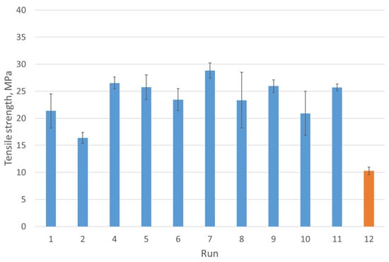 Tensile strength values: blue represents the experimental runs, while orange corresponds to the pure epoxy resin.