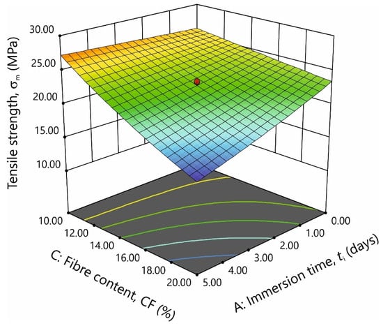 where: σm (MPa)—tensile strength, ti (days)—immersion time, cs (%)—solution concentration, CF (%)—coir fibre mass percentage.