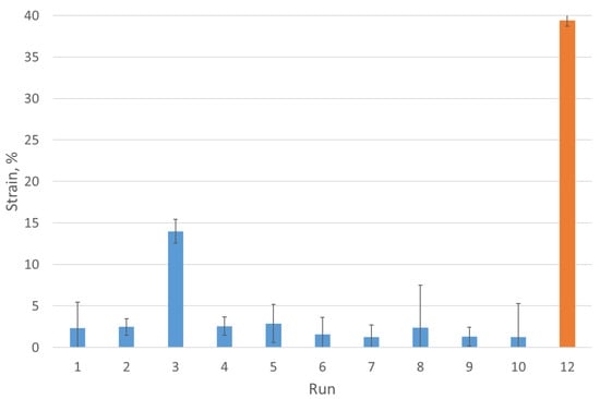 Strain values: blue represents the experimental runs, while orange corresponds to the pure epoxy resin.