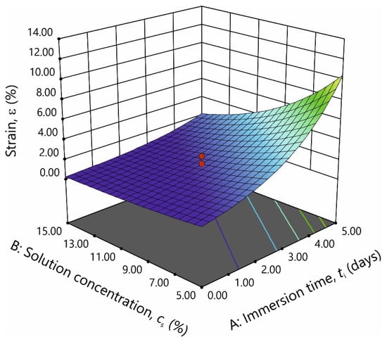 where: ε (%)—strain, ti (days)—immersion time, cs (%)—solution concentration, CF (%)—coir fibre mass percentage.