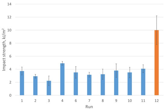 Impact strength values: blue represents the experimental runs, while orange corresponds to the pure epoxy resin.