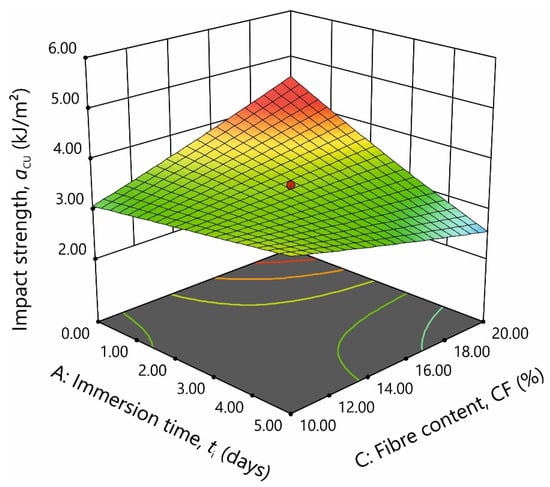 where: aCU (kJ/m2)—impact strength, ti (days)—immersion time, cs (%)—solution concentration, CF (%)—coir fibre mass percentage.