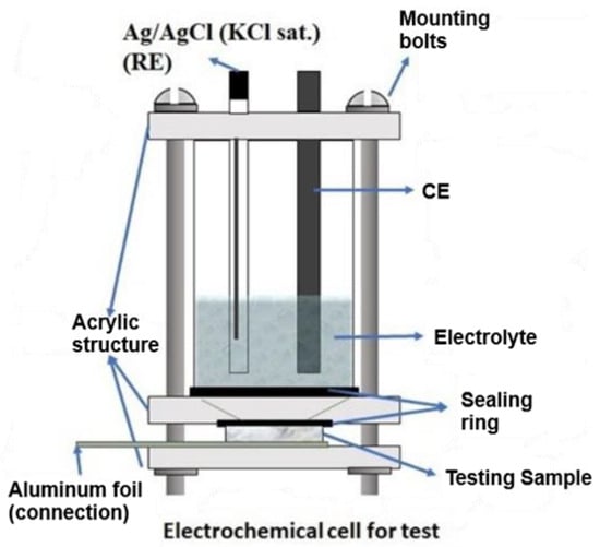 Design of the electrochemical cell of three-electrode configuration used for the corrosion testing of hydroxyapatite ceramic material.