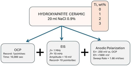 Electrochemical tests were conducted in a physiological environment, specifically using a saline solution of sodium chloride (0.9% NaCl), which is commonly used in medical applications to restore electrolyte salts lost due to dehydration. Samples of the bioceramic materials were studied in their as-received condition and were placed in an electrochemical cell, as illustrated in Figure 1. This electrochemical cell has a three-electrode configuration. At the top, two electrodes are positioned; one is an Ag/AgCl reference electrode (RE) (saturated with KCl), connected in parallel with a platinum wire and a 33 μF/10 mV capacitor element. This connection mitigates distortion caused by high-frequency interference, a very common problem in ceramic materials. The other electrode is related to a graphite bar, which serves as the counter electrode (CE), whereas, at the bottom of this cell, the test sample (HPa with varying titanium contents; 1%, 2% and 3%) acts as the working electrode (WE), with an exposed area of 0.8 cm2 to the test solution. So, measurements were achieved using a Prince Applied Research® Parstat 4000 potentiostat/galvanostat (Corrtest Instruments, Gyunggi-do, Republic of Korea), connected to a personal computer (PC) and controlled by Versa Studio software (VersaWorks, 6) for data acquisition. The experimental sequence, illustrated in Figure 2, began with an open-circuit potential (OCP) test of the ceramic material in the saline solution. The OCP behavior was monitored for 10,000 s without applying a current pulse, allowing the system to reach a thermodynamic equilibrium state in terms of corrosion potential. Following the OCP test, an alternate current (AC) as disturbance with a small amplitude was applied to the system. The Electrochemical Impedance Spectroscopy (EIS) technique is used with a frequency sweep ranging from 1 MHz to 10 mHz, with an amplitude of 10 mV and 10 data points per decade. The impedance data were analyzed and fitted to an appropriate equivalent electrical circuit (EEC) model to interpret the electrochemical behavior of the system. Subsequently, a direct current (DC) potential was applied through the anodic polarization technique to obtain more information about the reactivity and passivation capacity of the sample. The applied potential ranges from −250 mV to 1600 mV/ocp at a sweep rate of 1.66 mV/s. Electrochemical measurements were conducted after immersion times of 5, 48, 168, and 504 h.