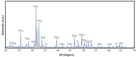 Figure 4 shows the X-ray diffraction pattern obtained for the sample with 3% titanium. It is worth mentioning that this analysis was only performed on this sample, since the low titanium content in the other samples would not be easy to detect. This pattern clearly shows that the sample is made up of two phases. The first and most abundant corresponds to hydroxyapatite, and the second, which has much less proportion due to the intensity of its peaks, corresponds to titanium. Both phases have a compact hexagonal structure. Due to the similarity in the crystal structures of the constituents of the sample, some diffraction peaks interpose. This pattern helps to verify the formation of a bioceramic consisting of two phases, a ceramic matrix corresponding to hydroxyapatite and a second metallic reinforcement phase corresponding to titanium.
