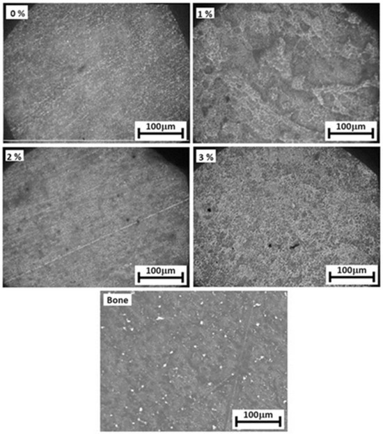 Figure 5 shows the microstructure observed via optical microscopy of the samples fabricated here and compares it with that of cortical bone. The microstructures of biomaterials are very fine, homogeneous, and have similar characteristics. The presence of porosity in the samples is not evident, which is indicative that the pore size in the samples is extremely small. With respect to the microstructure of the cortical bone, there are no major differences between what is being presented here, both microstructures being very homogeneous, although in the microstructure of the bone, the presence of porosity is evident.