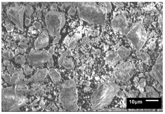 Figure 6 shows the morphology of the sample with 3% titanium that was fractured after sintering. The observation was made with the aid of a scanning electron microscope. In this figure, particles with large sizes close to 10 microns are observed, and the most important thing is that there are also very fine particles homogeneously distributed. Another observation is the rounded shape of the particles, which is due to the mechanical milling to which the powders were exposed. In general, the morphology of the particles is equiaxial. The titanium particles are not visible due to their fine size.