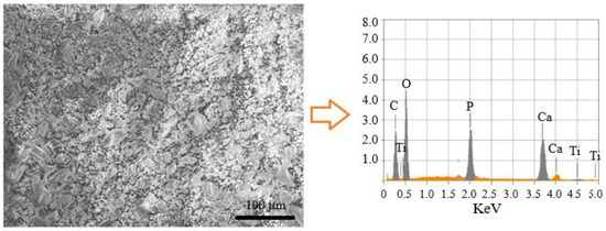 Figure 7 shows the general microstructure of the sample with 3% titanium, as well as the energy-dispersive X-ray analysis performed on the sample. The spectrum resulting from the analysis shows the chemical constituent elements of the sample, Ca, P and O, chemical elements that correspond to hydroxyapatite. The presence of titanium, which is the reinforcing material used, is also noticeable. With this analysis, the formation of the biomaterial consisting of HPa/Ti is verified once again. The microstructure sample exhibited particles with multimodal grain sizes oscillating from very small to about 50 microns. The porosity is not evident, nor for titanium particles; this is indicative of the very small size of both pores and titanium reinforcements.