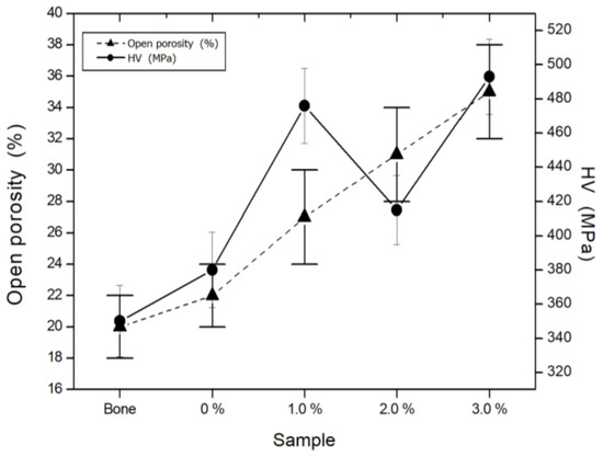 Figure 8 shows the porosity in each of the samples. This graph shows an increasing value of porosity as the titanium content in the sample increases. Observing the porosity value in cortical bone, it is 20% and is lower than the porosity of the samples prepared here. Valdespino Padilla, in his thesis work [27], states that porosity in a biomaterial is important, since it is the source for the growth of bone tissue in grafts. Similarly, the presence of porosity favors the dispersal of stresses when the material is working under loads. Considering this, the optimum porosity values should be between 20 and 30%, which are the values obtained in all the samples processed here.