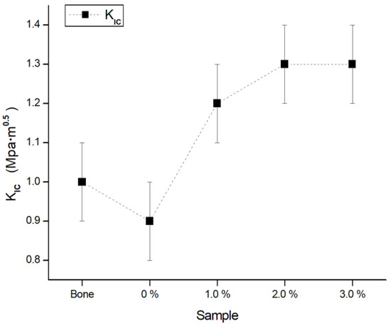 Figure 10 shows the values obtained from the fracture toughness measurements for each study sample. As expected, the fracture strength of HPa increases as the additions of the metallic phase in HPa increase. This is due to the ductile nature of titanium compared to the brittleness of HPa. In the case of the pure HPa sample, the fracture toughness value was the lowest. On the other hand, the samples with the highest Ti content have the highest toughness value, improving this value by 30% with respect to that of cortical bone. For the sample with 1% Ti, the fracture toughness improves by 20% with respect to the value of the bone. The reinforcement mechanism proposed here by many authors is the deflection of cracks when they grow and their advance is interrupted by the presence of metallic particles, which stop or deviate their trajectory, thus requiring greater efforts so that the crack can continue to grow [28,29,30].