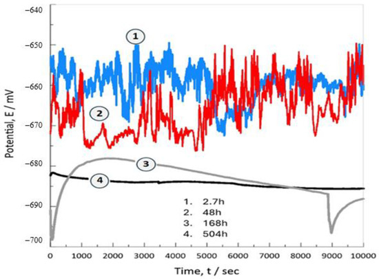 Figure 11 illustrates the electrochemical behavior at open circuit potential (OCP) in relation to the activation potential E (mV) of the ceramic surface immersed in a 0.9% NaCl saline solution of simulating human saline. Data were collected over an immersion period ranging from 5 to 504 h without applying an external current signal in the presence of a Ag/AgCl reference electrode. Based on previously investigated properties such as microstructure and mechanical characteristics, the hydroxyapatite bioceramic reinforced with 1% titanium (Ti) exhibited the best structural and mechanical performance. Consequently, Figure 9 focuses on the electrochemical curves at OCP for bioceramics containing 1%Ti. The curves labeled 1 and 2 represent the OCP transients after 5 and 48 h of immersion in NaCl, respectively. During the 10,000 s evaluation period, these curves exhibit a highly unstable active trend, fluctuating between −670 and −650 mV. Notable changes in the potential value are observed, probably due to the ingress of chlorides into the pores of the ceramic matrix, causing surface hydration. Specifically, hydroxide compounds progressively obstruct the ceramic matrix’s pores. This suggests that the surface activation process is driven by ion transfer, which is the predominant process in the initial hours of immersion.