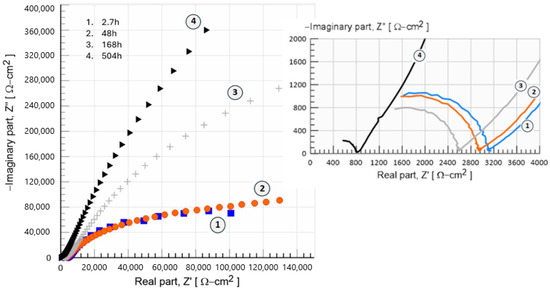 The electrochemical parameters associated with this passive surface can be obtained by modeling the experimental data with an equivalent electrical circuit (EEC), such as the one proposed in Figure 15. The arrangement of this circuit is simple: it has a resistor, Rs, which represents the resistance of the solution connected in series with the resistor, Rc, representing the resistance of the biofilm, formed in parallel with a constant phase element, CPE (Q), which relates to the properties of the passive surface. These are connected in parallel to a resistor that characterizes the charge transfer through the passive surface/electrolytic interface, which is connected in series to a second constant phase element, CPE. In this circuit, a CPE is used instead of a pure capacitor to account for the non-ideal behavior of the passive surface. The values of the electrochemical parameters obtained from the Nyquist diagrams are illustrated in Table 1.