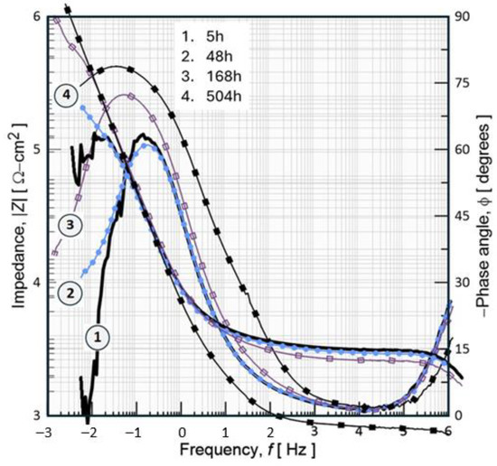 The diameter of these semicircles correlates with load transfer resistance, Rct; a larger diameter indicates greater stability of the material against corrosive attack due to the presence of a hydrated film that protects it. The Bode diagrams in Figure 12 allow one to understand and observe the mechanisms of charge transfer as a function of frequency, providing detailed information on the kinetics of the reactions and the processes of charge and mass transport. In this case, the absolute impedance Z’s magnitude and the sinusoidal signal’s offset angle F applied to the interface over a measured frequency range are plotted.