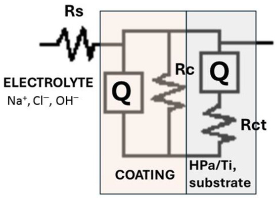 In Figure 15, an electrical model or equivalent circuit is proposed to simulate the interface mechanisms using a combination of resistors and capacitances, connected in series-parallel, depending on the surface conditions. This validation ensures the integrity of samples as a biomaterial with the possibility of functioning as an implant.