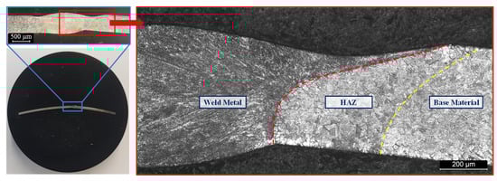 Thermal analysis was employed to calibrate the model using an iterative trial-and-error procedure. This method was applied to assess both the temperature and the convection coefficient of the heat exchange windows incorporated into SFTC DEFORM-3DTM for modeling the welding heat source. After welding, three samples, each 30 mm in length (along the welding direction, as shown in Figure 1), were cut for each experimental test, resulting in a total of nine samples. The transverse sections of the samples were embedded in black bakelite resin for microstructural investigation and hardness measurement. Metallographic preparation involved mechanical polishing followed by etching with a V2A reagent (119 mL distilled water, 12 mL nitric acid, and 119 mL hydrochloric acid). The cross-sections were examined using an optical microscope (Leica DFC320) at magnifications of 500× and 1000× to analyze weld bead geometry, HAZ extension, and grain size evolution. Figure 2 presents a micrograph obtained from the optical microscope, clearly distinguishing the weld metal (melted area), the HAZ, and the base metal (unaffected material). The HAZ size was approximately 477 ± 33 µm, determined by assessing both grain size evolution and hardness variation. Micro-hardness [HV0.1] was measured using an instrumented micro-indentation tester (MHT, Anton Paar GmbH).