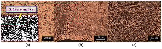 Figure 3 illustrates the grain size evolution across the different zones affected by the welding process. Grain size measurements were conducted using the commercial software ImageJ, which identifies individual grains based on their boundaries (Figure 3a). It shows an equiaxial grain structure in both the base material and HAZ, while a lamellar structure is observed in the weld metal. Specifically, Figure 3a represents the grain size in the unaffected zone (base material), with an average value of 60 µm. In contrast, Figure 3b highlights the coarser grains in the HAZ, with an average size of 145 µm, resulting from the elevated temperatures that promote grain growth. Finally, Figure 3c shows the lamellar grain structure in the weld zone.