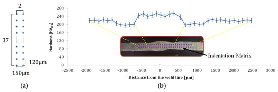 (a) Hardness indentation matrix and (b) transverse section indentation measurement.