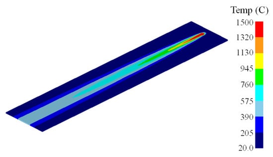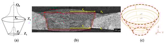 To simulate the PAW process, a three-dimensional Gaussian conical heat source model was utilized, where re and ri represent the upper and lower cone radii, respectively, and ze and zi denote the cone length parameters (Figure 6a). This heat source model was implemented in the software by defining a series of 3D heat exchange windows that replicated the shape of the Gaussian model (Figure 6c). The heat source was characterized by a movement velocity of 69.33 mm/s, in accordance with the experimental welding speed parameters.