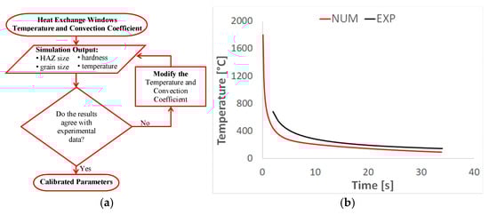 Specifically, the parameters re, ri, ze, and zi were measured on the welded component (Figure 6b). Meanwhile, the temperature and convection coefficient of the heat exchange windows were calibrated using an iterative trial-and-error method, comparing numerical and experimental data for HAZ size, grain size, hardness, and temperatures (Figure 7).