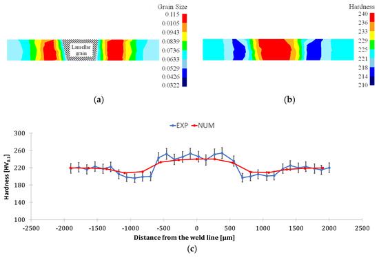 Numerical predicted (a) grain size in mm, (b) hardness [HV0.1] evolution, and (c) comparison between measured and predicted hardness variation.