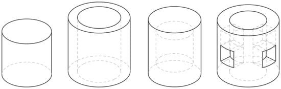 For this research project, four cylindrical geometries were considered to represent the solid dosage forms. These were the Solid Cylinder (SC), a cylindrical shell named Hollow Cylinder 1 (HC1), a cylinder with a central opening named Hollow Cylinder 2 (HC2), and a cylindrical shell with four square openings equally spaced in the middle named Hollow Cylinder 3 (HC3). The selection of the four geometries was specifically aimed at achieving significant variation in the mass, surface area, and surface-area-to-volume ratio to enable a detailed investigation of their effects on dissolution behaviour. The dimensions of the geometries were also tailored to the resolution capabilities of the 3D printer to ensure precise fabrication of the samples with the desired parameter variations. These geometries are demonstrated in Figure 1.