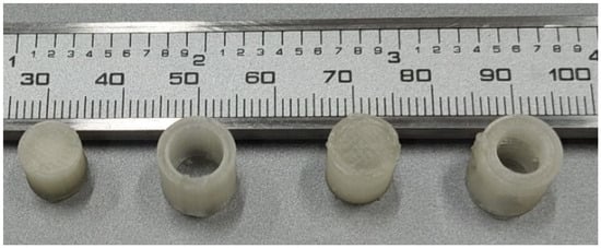 The four unique geometries corresponding to each set of samples were fabricated using an Ultimaker 3 FDM 3D printer with the layer height set at 0.1 mm and an infill density of 100% while utilising a 0.4 mm nozzle at a working temperature of 200 °C. This facilitated consistent layer bonding and ensured the structural integrity of the material. For each unique geometry, three replicate samples were 3D printed for further testing to improve the accuracy and reliability of the experimental analysis, making the total number of printed and analysed samples 36. An image of a set of geometries with similar surface areas is shown in Figure 2 as an example.