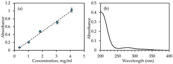 (a) The calibration curve for converting the absorbance to the concentration of PVA dissolved in water (coefficient of determination, R2 = 0.99), and (b) the UV absorption standard curve for the PVA.