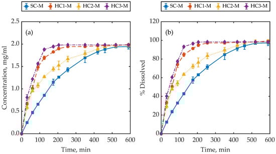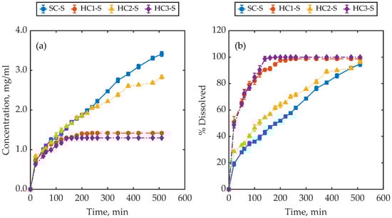 The changes in the concentration of the dissolved polymer and the polymer percentage dissolved over time for samples with a similar surface area are shown in Figure 5. Unlike in the previous set of samples, where the concentration–time graph closely resembled the % dissolved–time graph due to similar sample masses, in this set HC1-S and HC3-S have significantly smaller masses compared to SC-S and HC2-S. As a result, these samples with a smaller mass contribute less to the concentration of the solvent, which is reflected in the lower curves on the concentration–time graph. However, their smaller mass allows them to dissolve more rapidly percentagewise, resulting in higher curves on the % dissolved–time graph. Similar to previous results, for the HC1-S and HC3-S geometries, the release profiles suggest a rapid release response, whilst for SC-S and HC2-S the time required to fully dissolve the samples was larger and polymer release was sustained over a longer period (Figure 5b).