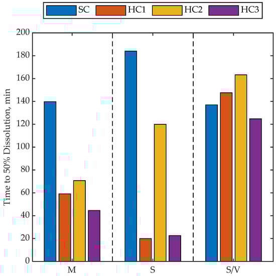 The dissolution behaviour of pharmaceutical tablets is a multifaceted process influenced by geometric parameters, surface properties, and solvent interactions. While earlier sections have explored specific geometric influences such as the surface area and S/V, this section synthesises these findings to provide a broader understanding of their combined impact. Figure 7 compares the average time to 50% dissolution (half dissolution time) for all 12 unique geometries, enabling a ranking of the geometries based on their dissolution performance. It can be observed that the SC-S specimen exhibits the longest half dissolution time, which correlates with its having the lowest S/V (0.61 mm−1) among the 12 samples, as shown in Table 2. Conversely, the two samples with the shortest half dissolution times, HC3-S and HC1-S, have the highest S/V, 1.69 mm−1 and 1.57 mm−1, respectively. For samples with a similar S/V, the half dissolution times remain within the same range, reinforcing the critical role of the S/V in determining dissolution rates. These findings underscore how surface area, mass, and topology can be tailored to achieve a desired dissolution response, offering valuable insights for designing solid dosage forms with specific dissolution characteristics.