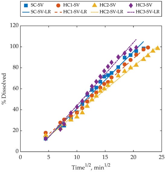 Linear regression (LR) plots of cumulative drug release (% dissolved) versus the square root of time for specimens with a similar S/V fitted to the Higuchi model.