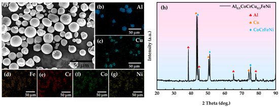 SEM image and EDS elemental distribution of the raw powder: (a) SEM image of the mixed powder; (b–g) EDS elemental distribution of the powder; (h) XRD pattern of Al0.5CoCrCu0.5FeNi power.