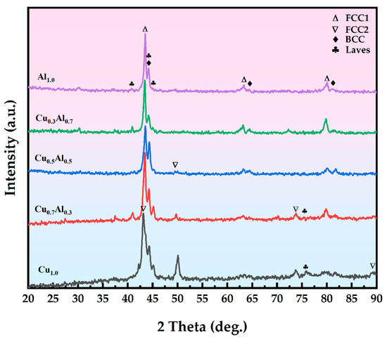 Figure 2 presents the X-ray diffraction (XRD) patterns of the AlxCoCrCuyFeNi (x = 0, 0.3, 0.5, 0.7, 1.0; y = 1.0, 0.7, 0.5, 0.3, 0) HEA coatings with varying Al and Cu ratios. The microstructure of the coatings was composed of FCC, BCC, and a small amount of Laves phases. The FCC phase includes the matrix phase (FCC1) and the Cu-rich phase (FCC2), while the BCC phase is primarily Fe-Cr-rich and the hard Laves phase is rich in Ti. It can be seen that three prominent diffraction peaks appear at 43.12°, 63.32°, and 80.10°, corresponding to the main FCC solid solution phase, while a second set of peaks at 44.15°, 64.39°, and 81.80° corresponds to the BCC phase. This is attributed to the more constituent elements and the close atomic percentage of each element in the HEA, resulting in a higher mixing entropy and a lower Gibbs free energy in the system, which promotes the formation of random disordered solid solution phases with simple and stable microstructures [40]. It can be clearly seen that in addition to the main peaks, several smaller peaks are observed in the XRD patterns. According to the literature [41], and matching with PDF card data, these are attributed to Ti-rich Laves-reinforced phases. Furthermore, when the Cu content is 1.0, Cu-rich phases are detected at diffraction peaks of 43.12°, 50.08°, and 89.29°, but these peaks disappear when the Cu content is reduced to 0.3. This may be due to the low Cu content at which the X-ray diffraction cannot detect these phases. With the decrease in the Cu content, the intensity of the FCC peaks gradually diminishes. Simultaneously, with the increase in the Al content and the decrease in the Cu content, the intensity of the Laves phase diffraction peaks also decreases.