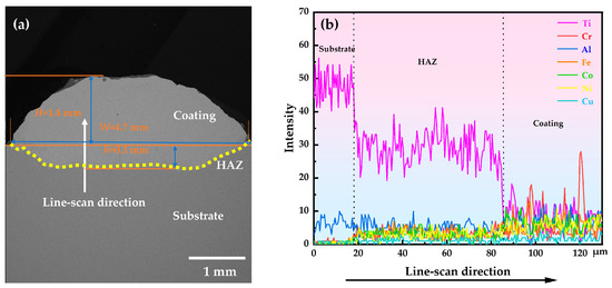 The cross-sectional microscopic morphology and the EDS line scanning distribution curves of different elements along the cross-section of the Al0.7CoCrCu0.3FeNi coating are shown in Figure 3a. According to the literature [42], the dilution rate is calculated using the following equation (Equation (1)):