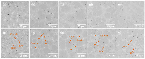 Microstructure of top and central coatings of AlxCoCrCuyFeNi HEA coatings: (a,f) Cu1.0; (b,g) Cu0.7Al0.3; (c,h) Cu0.5Al0.5; (d,i) Cu0.3Al0.7; (e,j) Al1.0; (a–e) top of coating; (f–j) center of coating.