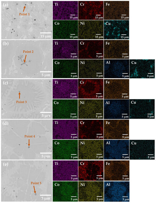 To further analyze the distribution of different elements, EDS scanning was performed, and the results are shown in Figure 5. Combined with the previously discussed XRD results, it is evident that the dark-gray microstructure in the dendrites corresponds to the FCC phase, while the light-gray microstructure in the inter-dendritic regions corresponds to the BCC phase. Due to the mutual dilution between the coating and the substrate, the Ti element from the Ti6Al4V alloy substrate is continuously diffused into the coating during the laser cladding process, leading to an increased Ti element in the coating. This promotes the formation of the FCC phase enriched in Al-Co-Ni-Ti, which grows into equiaxed crystals. During the solidification process, the content of Fe and Cr elements in the liquid molten pool gradually increases until it reaches the maximum solubility limit of the liquid metal, at which point these elements precipitate as an alloy phase. Since Cr has the highest melting point, it is preferred to precipitate to form a Fe-Cr-rich BCC phase. At the same time, the atomic radius of Ti is significantly larger than that of other elements, and the mixing enthalpy is low, resulting in the segregation of Ti elements in the coating and the formation of dispersed Laves phases. The EDS analysis results at different locations in Figure 5 are provided in Table 2. The black petal-like precipitates and the black particles dispersed in the coating are Ti-rich Laves phases.