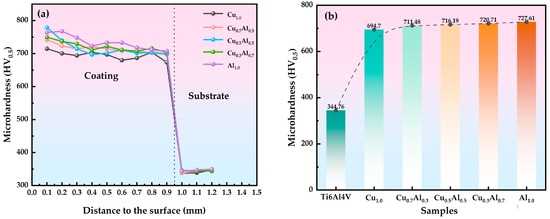 Microhardness results of the coatings and Ti6Al4V alloy: (a) microhardness distribution; (b) average microhardness.
