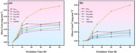The oxidation resistance of the Ti6Al4V alloy and HEA coatings was evaluated at 800 °C for a total duration of 50 h, with measurements taken at intervals of 5 h, 10 h, 15 h, 30 h, and 50 h. Figure 7a shows the oxidation mass gain per unit area for the Ti6Al4V alloy substrate and the AlxCoCrCuyFeNi (x = 0, 0.3, 0.5, 0.7, 1.0; y = 1.0, 0.7, 0.5, 0.3, 0, x + y = 1) HEA coatings. The results indicate that the oxidation mass gain for the HEA coatings and Ti6Al4V alloy substrate are 0.156 mg·mm−2, 0.143 mg·mm−2, 0.133 mg·mm−2, 0.118 mg·mm−2, 0.098 mg·mm−2, and 0.283 mg·mm−2, respectively. Compared to the Ti6Al4V alloy, the oxidation rates of the Cu1.0, Cu0.7Al0.3, Cu0.5Al0.5, Cu0.3Al0.7, and Al1.0 HEA coatings decreased by 55%, 51%, 47%, 42%, and 35%, respectively. The oxidation mass gain of the HEA coatings is significantly lower than that of the Ti6Al4V alloy substrate. In addition, the addition of Al content improves the oxidation resistance of the AlxCoCrCuyFeNi HEA coatings. Before 15 h, all of the HEA coatings exhibit a rapid initial increase in oxidation mass gain, which is attributed to the rapid oxide growth at the early stages of the oxidation process [46]. During this stage, the initial oxide layer nucleates and grows on the surface, primarily consisting of less protective oxides. Over time, the oxidation mass gain of the HEA coating increases slowly, whereas the oxidation mass gain of the Ti6Al4V alloy substrate increases rapidly. This difference in behavior suggests that the formation of the oxide layer is controlled by the outward diffusion of the constituent elements with high diffusion coefficients. To better understand the oxidation kinetics of the AlxCoCrCuyFeNi HEA coatings, a power function [47,48] (Equation (2)) was used to fit the oxidation mass gain as a function of time: